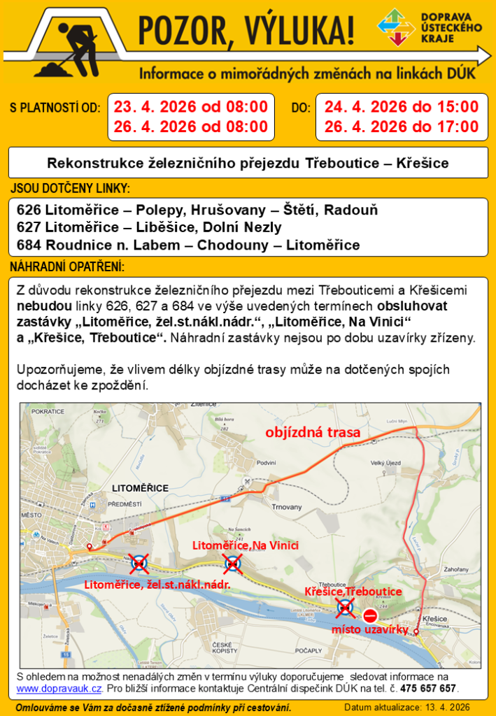 V období od 23. dubna 2026 do 24.dubna a 26. dubna 2026 dojde k mimořádné výluce na vybraných linkách DÚK z důvodu rekonstrukce železničního přejezdu Třeboutice — Křešice. Dotčeny budou linky 626, 627 a 684, které nebudou v uvedených termínech obsluhovat některé zastávky.