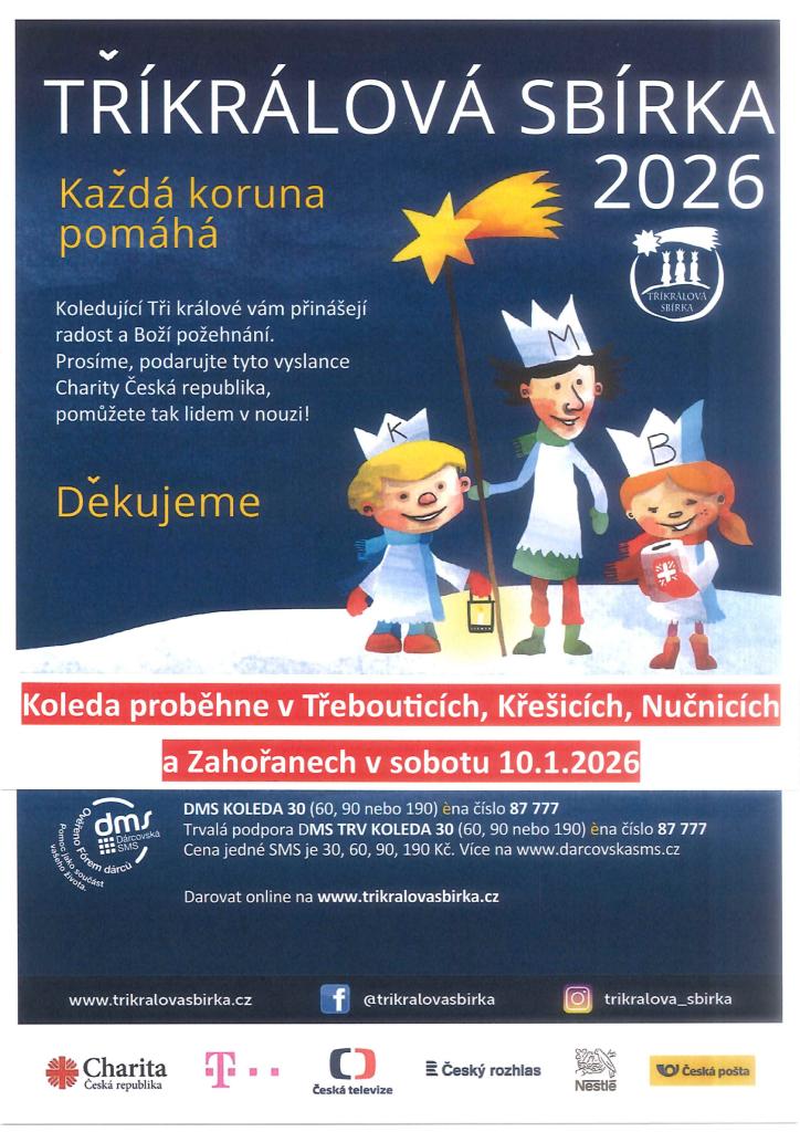 Oznamujeme občanům, že v sobotu 10.1.2026 se v Třebouticích, Křešicích, Nučnicích a Zahořanech uskuteční Tříkrálová sbírka. Tři králové budou vybaveni zapečetěnou kasičkou s logem Charity ČR.