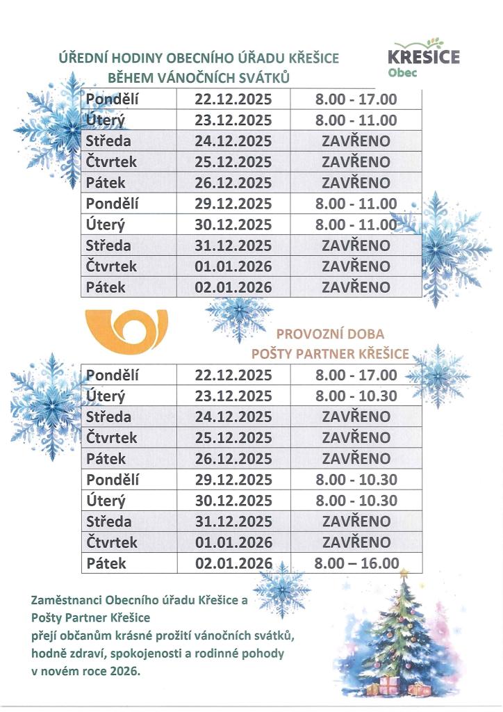 ÚŘEDNÍ HODINY OBECNÍHO ÚŘADU KŘEŠICE A PROVOZNÍ DOBA POŠTY PARTNER KŘEŠICE BĚHEM VÁNOČNÍCH SVÁTKŮ Typ: DOCX dokument, Velikost: 1.02 MB